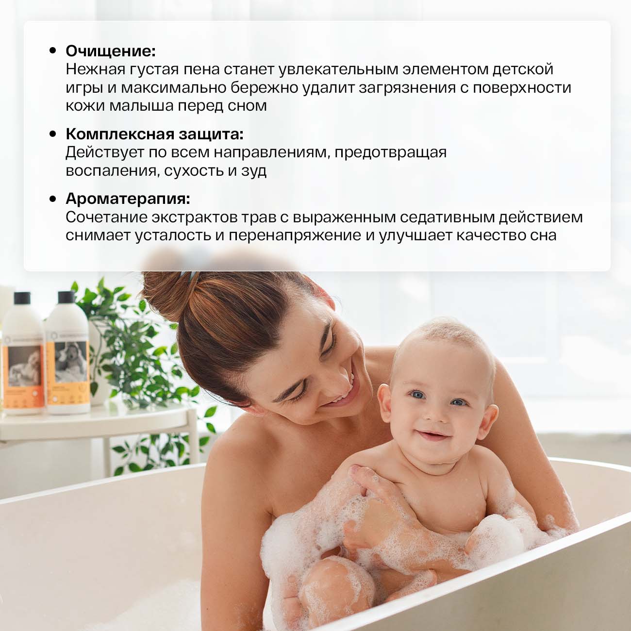 Очищение: нежная густая пена станет увлекательным элементом детской игры и максимально бережно удалит загрязнения с поверхности кожи малыша перед сном. Комплексная защита: действует по всем направлениям, предотвращая воспаления, сухость и зуд. Ароматерапия: сочетание экстрактов трав с выраженным седативным действием снимают усталость и перенапряжение и улучшают качество сна