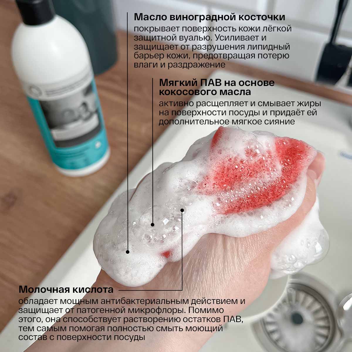 Молочная кислота: обладает мощным антибактериальным действием и защищает от патогенной микрофлоры. Помимо этого, она способствует растворению остатков ПАВ, тем самым помогая полностью смыть моющий состав с поверхности посуды