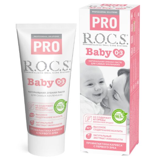 Зубная паста R.O.C.S. BABY PRO предназначена для детей с грудного возраста и до 3-х лет. Паста отличается тем, что содержит в составе реминерализирующий комплекс, такой же, как в геле R.O.C.S. Medical Minerals: ксилит – 10%; кальция глицерофосфат, магния хлорид. Благодаря ему паста эффективно укрепляет детскую эмаль и предотвращает появление кариеса.
