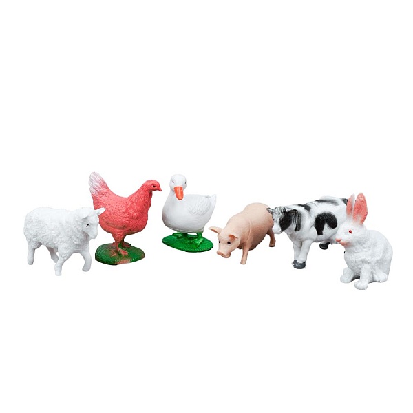 Игрушки из серии «Рассказы о животных» – копии реальных рептилий, зверей, птиц и насекомых. Благодаря таким игрушкам, можно легко и весело познакомить ребёнка с домашними животными. Пластизолевыми игрушками можно играть на улице и в ванной, они не промокают и легко моются. В набор «Домашние животные» входят: свинья – 8 см, овца – 7 см, заяц – 5 см, курица – 7 см, корова – 9 см, утка – 6 см.