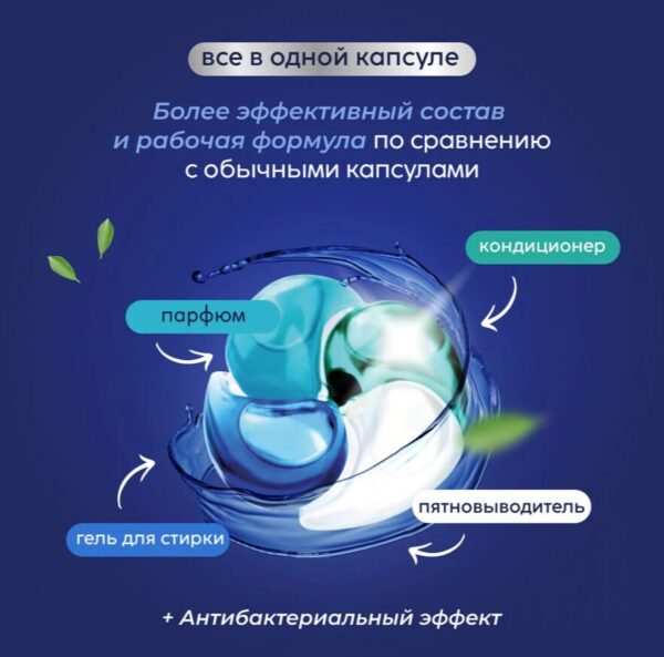 Использование капсул значительно упрощает процесс стирки: одна капсула заменяет несколько этапов с отдельным добавлением порошков, пятновыводителей и кондиционеров. Универсальный состав помогает эффективно справляться с различными типами загрязнений на белом и цветном белье, обеспечивая мягкость, чистоту и сохранение яркости тканей. Капсулы подходят для стирки как в горячей, так и в холодной воде, являясь универсальным решением для машинной и ручной стирки.