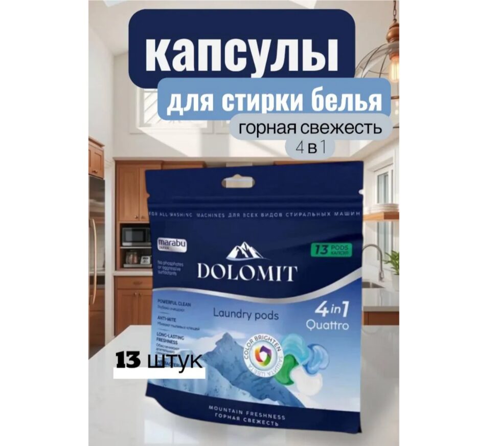 Капсулы для стирки белья универсальные Marabu серия Dolomit с ароматом Горная свежесть, 13 капсул 4 в 1 представляют собой профессиональное решение для безупречной чистоты и ухода за всеми типами тканей. Это универсальное средство формата гель в капсулах обеспечивает эффективную очистку белья и одежды в стиральной машине автомат, сочетая в себе функции стирального порошка, пятновыводителя, кондиционера и антибактериальной защиты. Жидкий концентрат в капсулах легко растворяется в барабане при температуре от 30 градусов, удаляя грязь, пятна и накипь, одновременно смягчая ткани встроенным кондиционером. Уникальная формула демонстрирует эффективность, в 8 раз превосходящую обычные средства, что гарантирует безупречный результат даже при низких температурах воды.