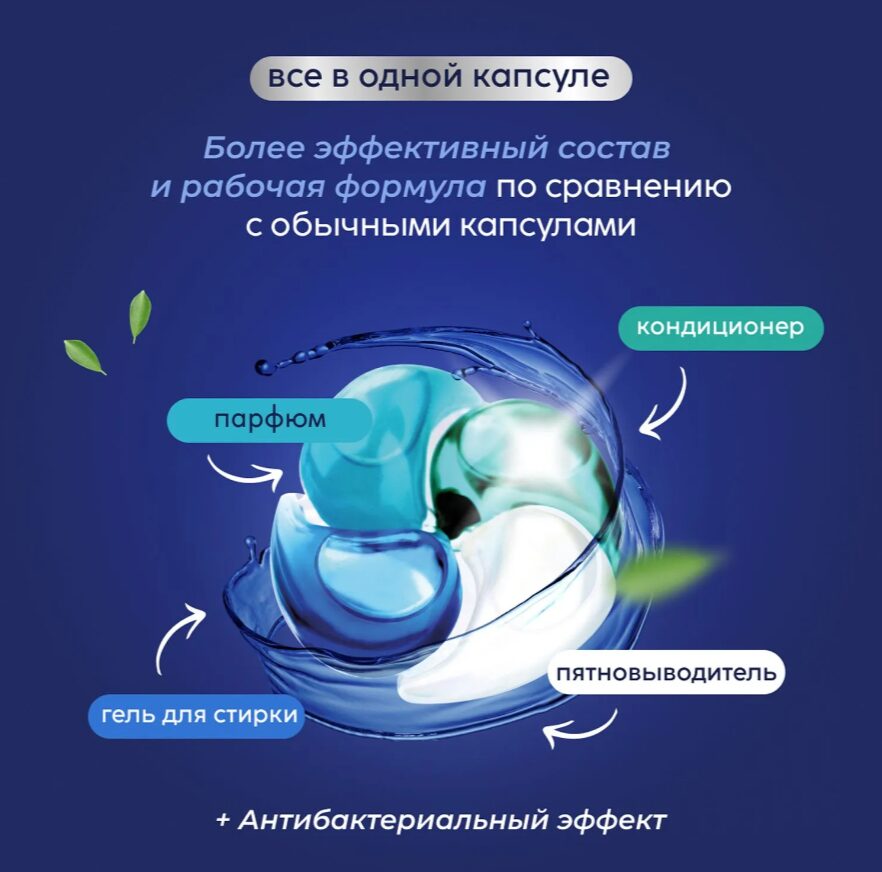 Использование капсул значительно упрощает процесс стирки: одна капсула заменяет несколько этапов с отдельным добавлением порошков, пятновыводителей и кондиционеров. Универсальный состав помогает эффективно справляться с различными типами загрязнений на белом и цветном белье, обеспечивая мягкость, чистоту и сохранение яркости тканей. Капсулы подходят для стирки как в горячей, так и в холодной воде, являясь универсальным решением для машинной и ручной стирки.