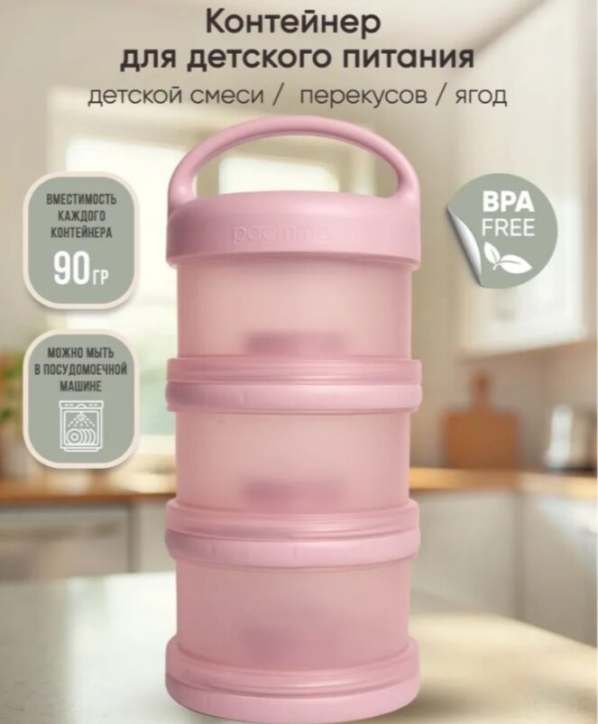 Контейнер для детского питания состоит из 3 отделений. Каждое отделение имеет специальную воронку с крышкой, что позволяет каждое отделение использовать отдельно и легко высыпать смесь в бутылочку. Контейнер удобно брать с собой в дорогу или подготовить несколько порций смеси для кормления на ночь. Широкий носик обеспечивает легкое и полное высыпание смеси из всех трёх отсеков. Крышка надежно закрывается. Каждый отсек контейнера вмещает 3 мерных ложки, 90 гр молочной смеси — отличный дозатор для детской смеси на улице, в гостях, ночью. В посуде для детей может храниться не только молочная смесь , но и пюре детское , творог и различные прикормы, детские сладости и снеки. Пищевой контейнер компактный, можно поместить в любую сумку (коляску).Изготовлен из 100% полипропилена, не содержит бисфенола А, ПВХ и фталатов и не взаимодействует с пищевыми продуктами, что делает его безопасным для использования в детском питании. Все детали контейнера для хранения детского питания можно стерилизовать, разогревать в микроволновой печи и мыть в посудомоечной машине. Благодаря своим компактным размерам и удобной форме контейнер не займет много места в сумочке , а наличие ручки поможет комфортно его переносить. Контейнер для детской смеси эргономичный, имеет надежную силиконовую ручку для крепления или переноса. Благодаря своей форме, контейнер для детского питания устойчив и легко поместится в несессер , сумку или рюкзак и станет поистине незаменимым помощником родителям малыша. Пищевой контейнер для детского питания Paomma представлен в трех цветах: сливочный, розово-коричневый и серо-зеленый. Это идеальный выбор для заботливых родителей, которые хотят сохранить здоровье своих детей и внести свой вклад в охрану окружающей среды. Контейнер под смесь можно легко мыть и использовать снова и снова, что делает его экологически чистым и экономичным в использовании. Покупайте этот контейнер для детского питания и уверены, что ваш ребенок будет питаться только качественной и безопасной пищей.