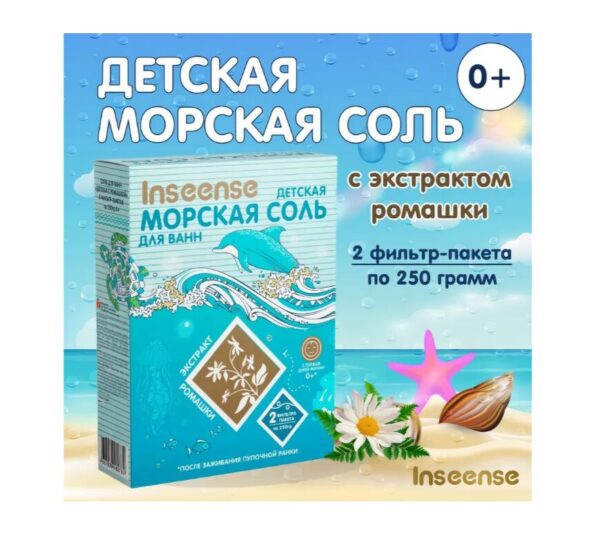 Морская соль Inseense для ванн, детская, 0+, после заживания пупочной ранки, экстракт ромашки, 2 шт х 250 г. Морская соль детская с ромашкой Inseense позаботится о здоровье вашего ребенка с первых дней жизни. Натуральная морская соль укрепляет организм, повышает иммунитет, улучшает и увлажняет кожу малыша. Благодаря полезным минеральным веществам стабилизирует нервную систему, нормализует сон. Восстанавливает состояние кожи на фоне аллергических реакций, дерматитов, опрелостей. Способствует нормальному функционированию дыхательной системы. Благотворно влияет на состояние сердечно-сосудистой системы, костно-мышечного аппарата. Позволяет избавиться от мышечных спазмов. Экстракт ромашки обладает противовоспалительным и успокаивающим действиями. Не содержит ароматизаторов и красителей, поэтому безопасна для использования даже у самых маленьких детей. Регулярные ванночки с морской солью снимают раздражение и шелушения, помогают предотвратить опрелости, дерматит и диатез. Косметическое средство также подходит для приготовления раствора для промывания носика, ускоряя процесс выздоровления. Расслабляющий эффект морской соли отлично подготовит ребенка ко сну. Сон малыша будет крепким и спокойным. Забота о здоровье и благополучии вашего ребенка начинается с правильного выбора косметических средств. Детская морская соль Inseense обеспечит малышу максимальный комфорт и заботу. 2 фильтр-пакета в коробке.