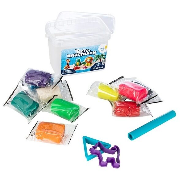 В наборе: 10 пакетиков с тестом-пластилином (5 классических, 5 с блестками), 1 скалка, 2 формочки.