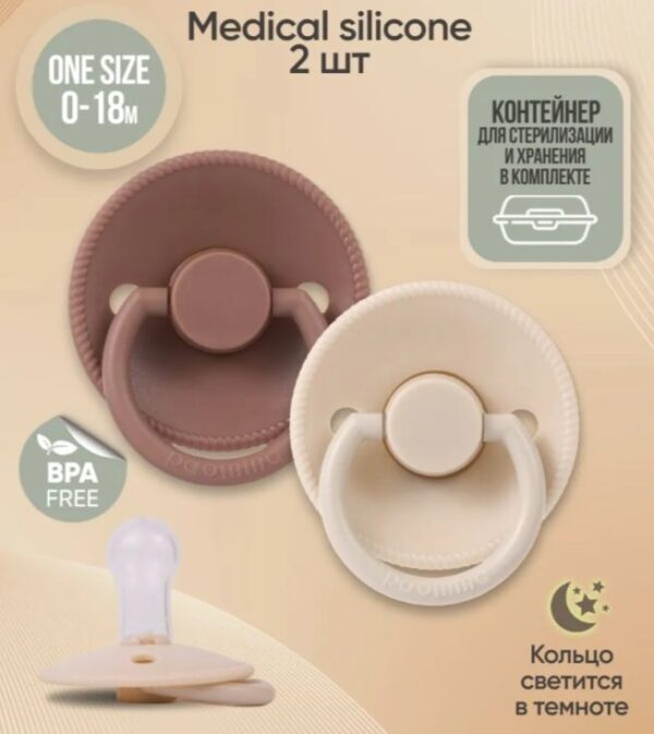 Набор силиконовых пустышек 0-18 мес Paomma 2 шт светящееся кольцо Almond milk/Taupe