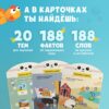 В комплект входят 47 двусторонних карточек, благодаря которым ваш кроха узнает 188 занимательных фактов про животных, транспорт, профессии и про многое другое.
