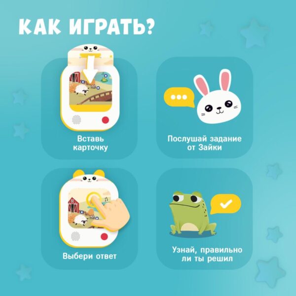А Зайка скажет, правильный ли это ответ или нет. Но даже если ребёнок ответил неправильно – не страшно, ведь благодаря Зайке у малыша разовьётся логическое мышление, концентрация и внимательность, А ещё улучшится воображение, память и речь!