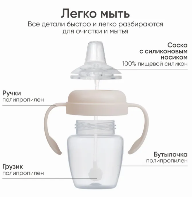 Поильник непроливайка с силиконовым носиком имеет минимум деталей, легко собирается, подходит для стерилизации и мытья в посудомоечной машине.