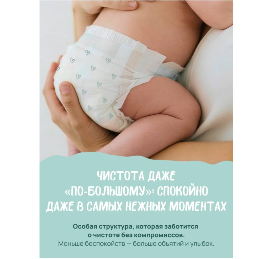 Подгузники не содержат ароматизаторов и не подвергаются хлорной обработке. В составе нет парабенов, фталатов, латекса и тяжелых металлов. Только мягкие и безопасные материалы, которым можно доверить самую нежную кожу.