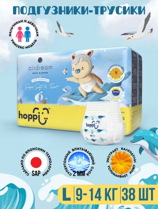 Подгузники трусики детские Hoppi AirDream, Размер L, 9-14кг, 38шт