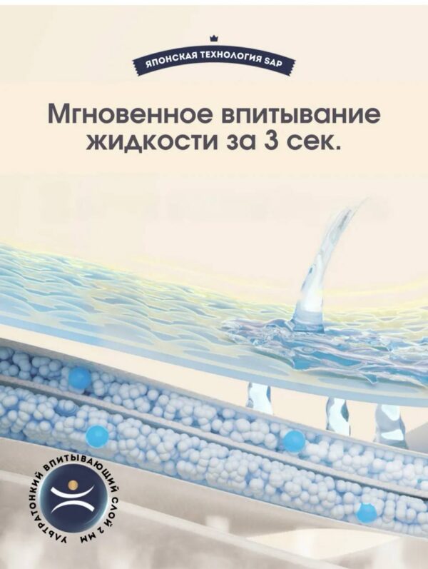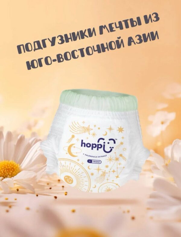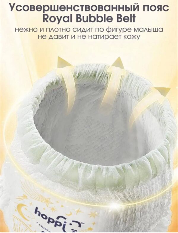 Представляем подгузники-трусики Hoppi RoyalDream без хлора и химикатов, созданные для новорожденных и малышей с чувствительной кожей. Они такие мягкие и тонкие, что малыш едва ли их заметит! Впитывающий слой, произведенный по инновационной технологии UltraCore, состоящий из сильно сжатой 7-слойной структуры, мгновенно поглощает жидкость без комкования. Благодаря трём слоям суперабсорбирующего полимера (SAP) и функции быстрого впитывания за 3 секунды, жидкость блокируется и удерживается внутри до 14 часов без малейшего протекания. Подгузник остается мягким и нежным к коже даже после того, как впитает много жидкости. Оборочки вокруг ножек предотвращают протекание. Японские технологии гарантируют спокойный сон малышу и маме всю ночь. Наши памперсы для новорожденных обеспечат нежную заботу о коже малютки с первых дней жизни. Подгузники изготовлены с использованием сверхмягких волокон с более чем с 50 000 дышащих микропор, что обеспечивает невероятную мягкость и воздухопроницаемость. Дышащий внешний слой позволяет воздуху циркулировать, оставляя кожу сухой и защищенной от опрелостей. Кроме того, благодаря экстракту календулы подгузники RoyalDream помогают предотвратить рост бактерий и образуют защитный слой вокруг попки вашего малыша, чтобы избежать раздражения кожи. Высокая талия, широкий и комфортный пояс Royal Bubble Belt, мягкие швы и полноразмерная выкройка обеспечивают удобную посадку. Продукция производится на основе передовых технологий стран Европы и Азии. Hoppi RoyalDream не содержат ворса, хлора, едких химикатов, формальдегида, тяжелых металлов, фталатов и идеально подходят малышам в качестве ночных подгузников! Липкая лента утилизации поможет закрепить края использованных трусиков. Подходят мальчикам и девочкам благодаря равномерному расположению впитывающего слоя. Не жертвуйте качеством – приобретайте подгузники Hoppi для новорожденных уже сегодня!