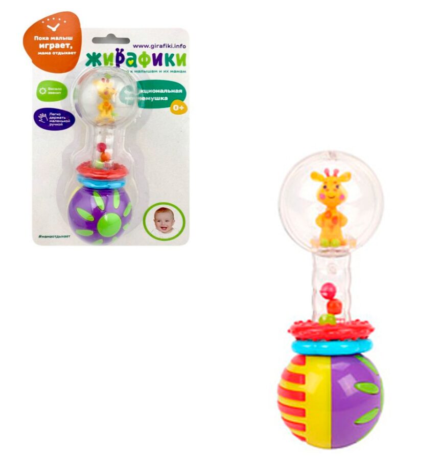 Внутри погремушки — очаровательная фигурка маленького жирафика и разноцветные шарики, которые очень весело гремят при встряхивании.