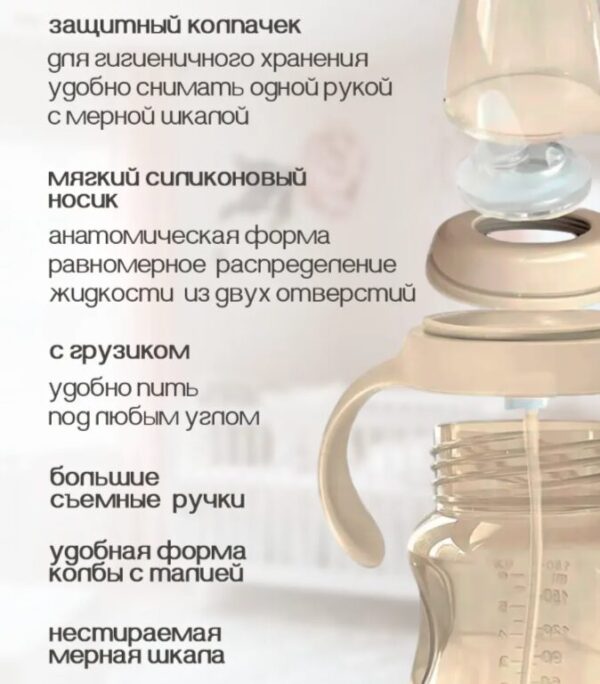 Поильник-непроливайка с мягким антиаллергенным силиконовым носиком идеально подойдет детям, которые учатся пить самостоятельно. Три отверстия в носике равномерно распределяют поток жидкости и предотвращают захлебывание. Благодаря грузику пить из поильника можно под любым углом. Эргономичные съемные ручки позволят малышу самостоятельно держать поильник и пить без посторонней помощи. Легкий и небьющийся. Малый объем в 180 мл оптимален в использовании. Нестираемая мерная шкала на колбе обеспечивает контроль жидкости. Колпачок с мерной шкалой защищает носик от загрязнения и может использоваться как мерный стаканчик. Изготовлен из безопасных качественных материалов. Подходит для разогревания напитков в микроволновой печи. Разрешается мытье в посудомоечной машине. Встают в сушку для бутылочек и в подставку для поильников и бутылочек детских.. Особенности: непроливайка с грузиком, мягкий антиаллергенный силиконовый носик, можно пить под любым углом, не содержит бисфенол-А. Возраст: от 6 месяцев. Материалы: полипропилен, силикон и нержавеющая сталь.