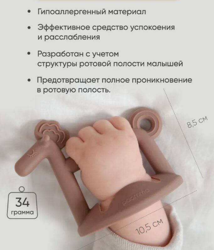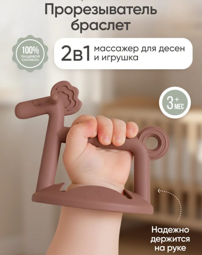 Уникальная конструкция позволяет надежно закрепить его на запястье малыша, что значительно упрощает использование. Не нужно беспокоиться о том, что он упадет на пол, что делает развивающую игрушку для новорожденных более гигиеничной и удобной, чем прорезыватель-погремушка, варежка, перчатка. Благодаря форме милого пони, игрушка для малышей привлекает внимание ребенка и развивает воображение, превращая его в первую и самую любимую игрушку до года.