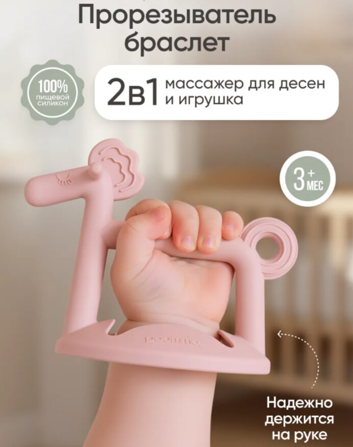 Прорезыватель «Paomma» — это идеальный помощник для малышей в период прорезывания зубов. Благодаря уникальной форме пони, прорезыватель вызывает интерес у ребенка и развивает фантазию. Конструкция в виде браслета надежно фиксируется на запястье, что предотвращает частые падения на пол, делая использование более гигиеничным. Грызунок выполнен из 100% пищевого силикона — это безопасный материал, который легко дезинфицируется кипячением, не вызывает аллергии и полностью безопасен для малыша. Уникальная форма прорезывателя адаптирована под ротовую полость и учитывает привычки ребенка, предотвращая полное проникновение изделия в рот. Массажные выступы для десен на голове и хвосте игрушки нежно массируют передние и задние десны, уменьшая зуд и дискомфорт. Прорезователь можно ставить вертикально, предотвращая контакт с поверхностями и сохраняя гигиеничность. Гармоничные пастельные оттенки грызунка отлично сочетается с интерьером детской комнаты и другими аксессуарами бренда Paomma.