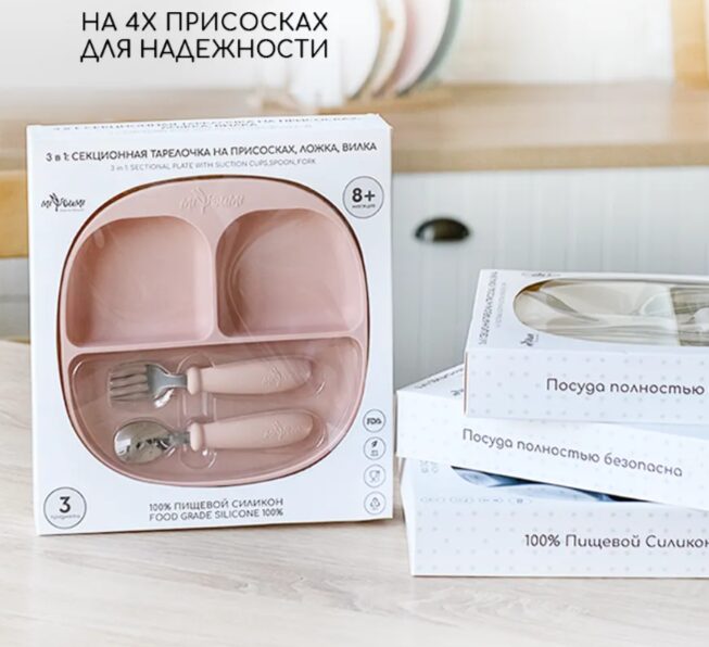 Набор детской посуды предназначен детям от 8 месяцев и старше Посуда выполнена из 100% пищевого силикона Тарелка крепится на 4 присоски которые позволяют более крепкого и надежного держаться на поверхности Имеет 3 секции которые позволяют не смешивать еду в тарелке при необходимости Тарелку на присоске можно разогревать в микроволновой печи Ложка для прикорма и вилка детская дополнены нержавеющей сталью Скругленные формы и края не могут повредить мягкие десна малыша Размеры рассчитаны на кормление маленькими порциями Перед первым использованием товары для малыша промыть моющим средством хорошо сполоснуть и просушить.