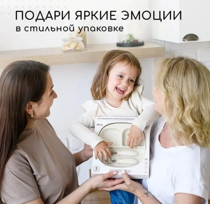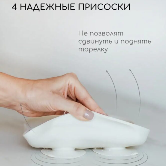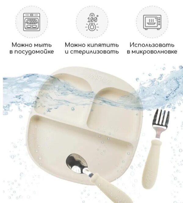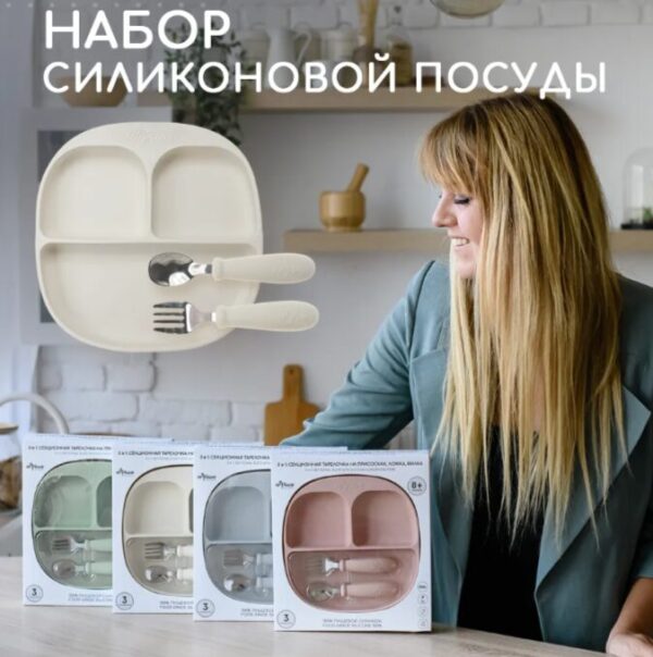 Набор детской посуды предназначен детям от 8 месяцев и старше Посуда выполнена из 100% пищевого силикона Тарелка крепится на 4 присоски которые позволяют более крепкого и надежного держаться на поверхности Имеет 3 секции которые позволяют не смешивать еду в тарелке при необходимости Тарелку на присоске можно разогревать в микроволновой печи Ложка для прикорма и вилка детская дополнены нержавеющей сталью Скругленные формы и края не могут повредить мягкие десна малыша Размеры рассчитаны на кормление маленькими порциями Перед первым использованием товары для малыша промыть моющим средством хорошо сполоснуть и просушить.