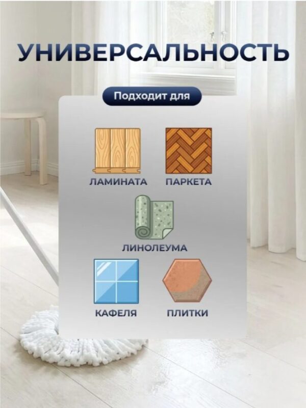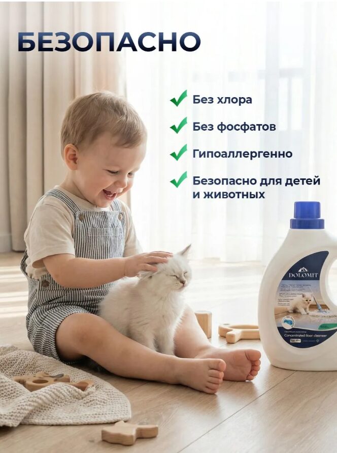 Специально разработанная формула бережно очищает любые типы напольных покрытий.