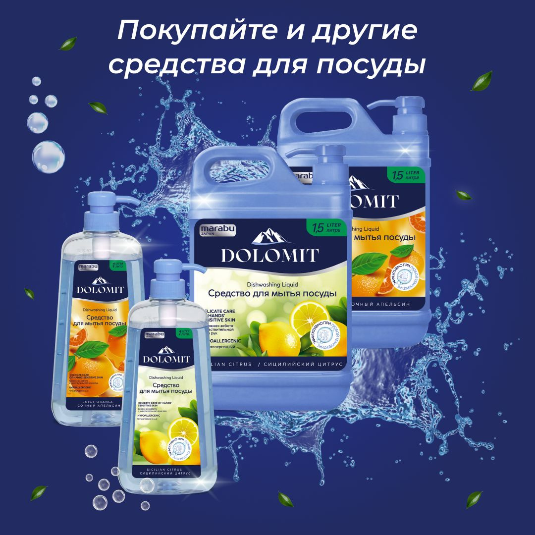 Гель для мытья посуды «сицилийский цитрус» DOLOMIT 1,5 литра с дозатором от MARABU — универсальное моющее средство для посуды, благодаря своей классической формуле имеет умеренное пенообразование, высокую концентрацию и густую консистенцию, одна капля средства образует обильную пену, которая эффективно поможет удалить жир, неприятные запахи и любую грязь с посуды, даже в холодной воде. Средство предназначено для ручного мытья посуды, столовых приборов, кастрюль, сковородок и других кухонных принадлежностей, работает как антижир. Благодаря безопасной формуле, гель для посуды бережно воздействует на кожу ваших рук, не вызывает сухости и раздражения, делает её мягкой. Гель является гипоаллергенным, а это значит – подходит для мытья детской посуды, сосок и игрушек. Наличие дозатора поможет вам экономично использовать наше средство. Способ применения: Нанести небольшое количество средства на губку, вспенить, вымыть посуду вспененным составом, смыть водой. Бытовая химия DOLOMIT — это незаменимый помощник в деле любой уборки. Мы рекомендуем выбирать качественные моющие средства от DOLOMIT, заботясь о вашем здоровье и окружающей среде.