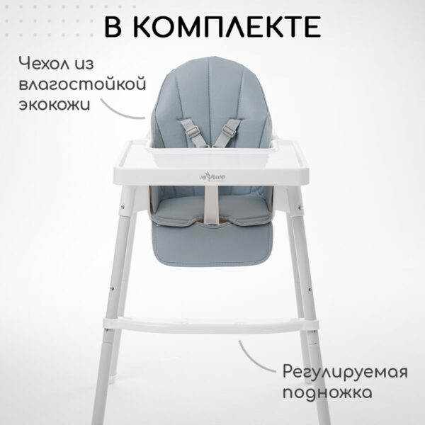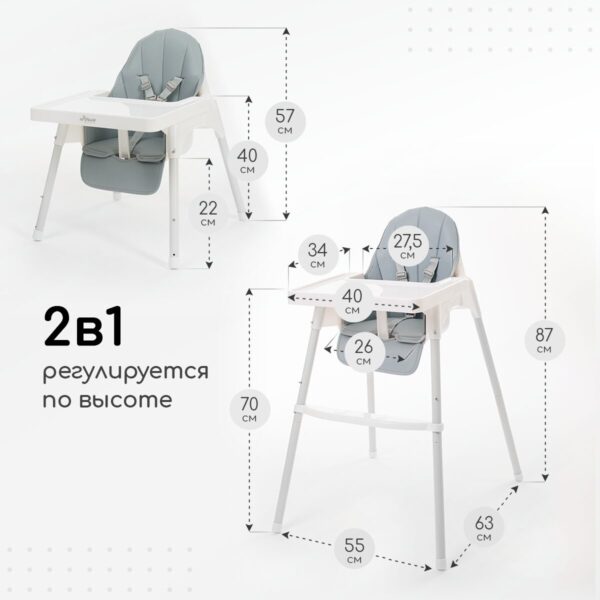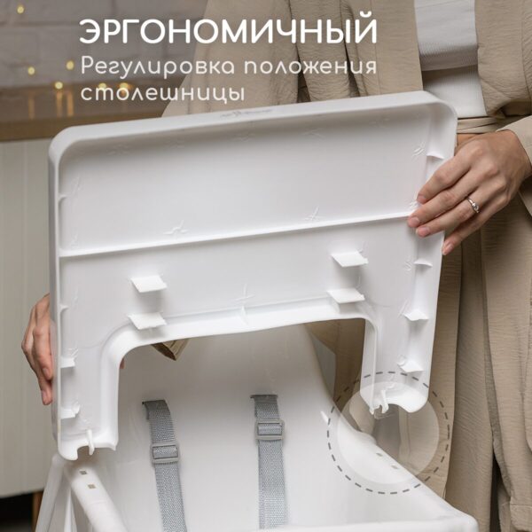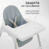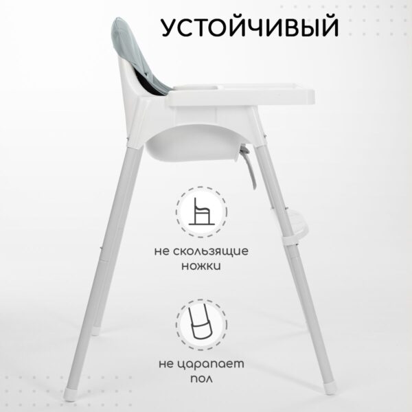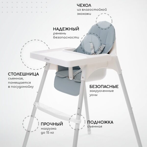 Стульчик изготовлен из abs-пластика и нержавеющей стали, выдерживает до 15 кг. Имеет чехол из влагостойкой экокожи, надежный ремень безопасности, съёмную столещницу. Благодаря своей эргономичной конструкции, обеспечивает правильную позицию для ребенка во время приема пищи. Оснащен удобным столиком, который идеально подходит для размещения посуды и кормления ребенка. Его можно легко установить и удалить после еды. «