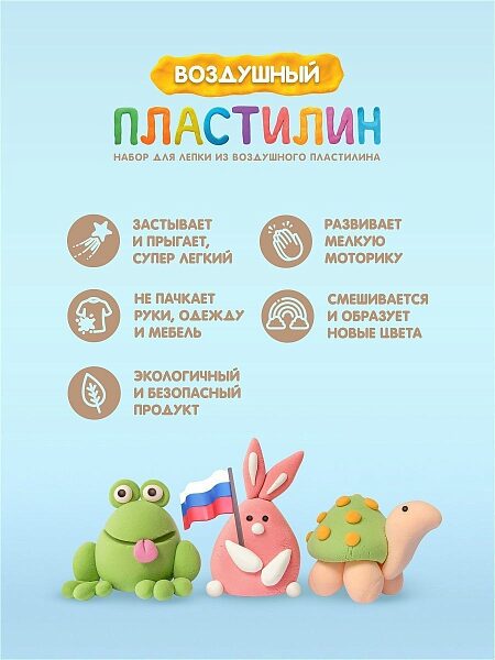 Особенностью нашего воздушного пластилина является суперлегкий вес и необычная текстура: он создан специально для детских пальчиков и легко поддается лепке, после высыхания полностью застывает и сохраняет форму фигурки.